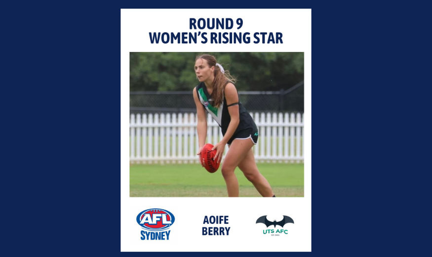 Player Profile: Name: Aoife Berry Nickname: Beefy AFL Sydney Club: UTS Bats Position: Centre What is one thing that we don’t know about this Rising Star that they are well known for around the club? ‘Beefy’ often forgets her boots to…