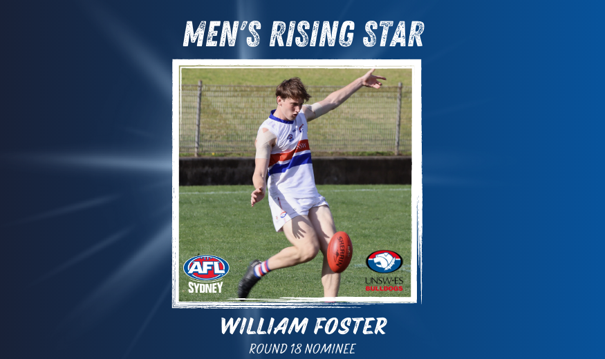 – Player Profile Name: William Foster Nickname: Billy AFL Sydney Club: UNSW Eastern Suburbs Bulldogs Position: Utility; Ruck, Tall Fwd/Def, Wing Junior Club: Figtree Kangaroos What is one thing that we don’t know about this Rising Star that they are…